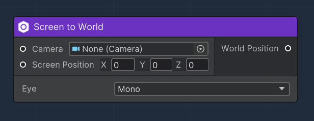 This OverNode is the equivalent of Unity's ScreenToWorldPoint. It converts a position from world coordinates (3D space) to screen coordinates (2D space as displayed on the screen), according to the camera's viewpoint and settings.