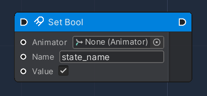 This node is used to set the value of the given boolean parameter, to cause transitions between Animator states.