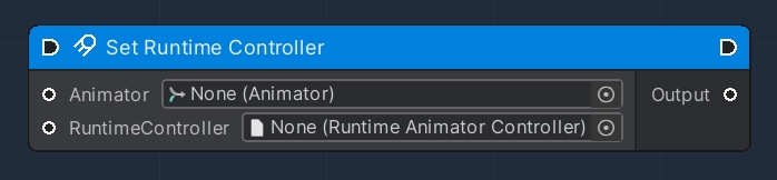 This node is used to modify an existing Animator Component, by setting a new RuntimeController.