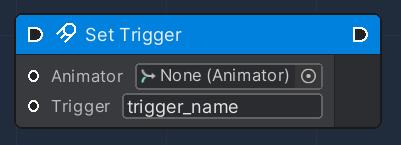 This node is used to set (i.e. activate) an animation trigger, to cause a change in flow in the state machine of an animator controller.
