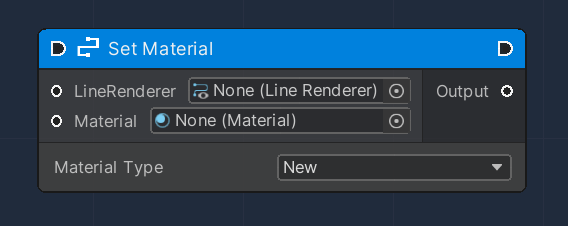 This node is used to modify an existing Line Renderer Component, by setting a new Material. A Material Type can be selected to instruct the node either to set the Shared Material or not.