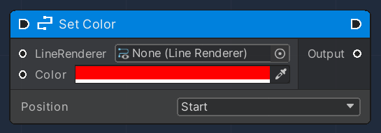 This node is used to modify an existing Line Renderer Component, by setting a new Color. A Position can be selected to instruct the node either to set the start or the end colour.