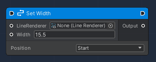 This node is used to modify an existing Line Renderer Component, by setting a new line Width. A Position can be selected to instruct the node either to set the start or the end line width.