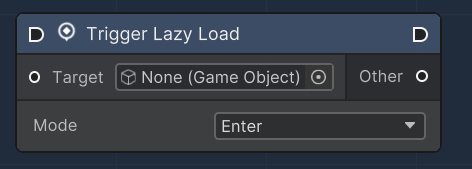 The "Trigger Lazy Load" node is designed to register a trigger event on a GameObject. When the GameObject's collider interacts with another collider in a specified mode (Enter, Exit, Stay), the node triggers an event.