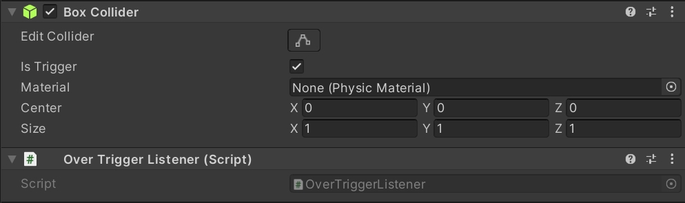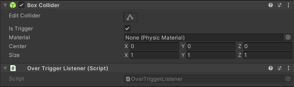 GameObjects involved in the collision must contain a Collider component. One must have Collider.isTrigger enabled, and contain a Rigidbody. If both GameObjects have Collider.isTrigger enabled, no collision happens. The same applies when both GameObjects do not have a Rigidbody component.