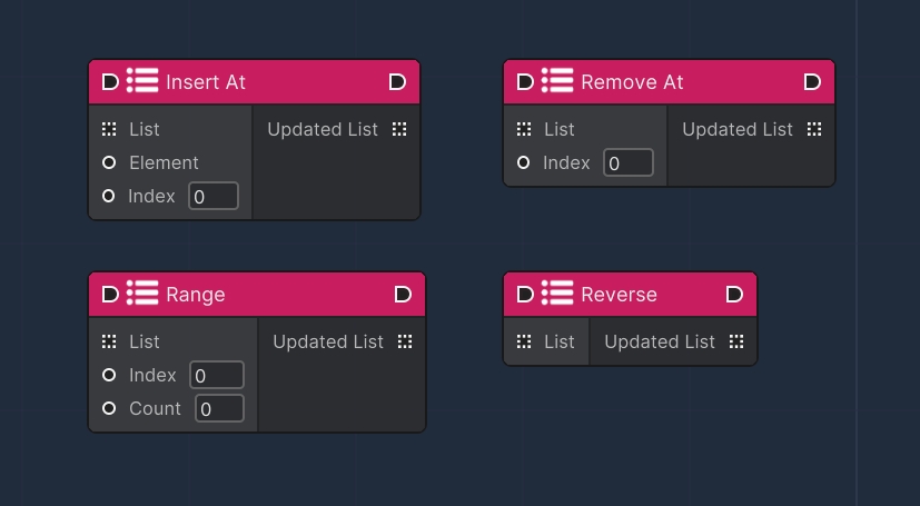 These nodes are responsible for implementing more advanced list operations that require Flow Nodes to operate: