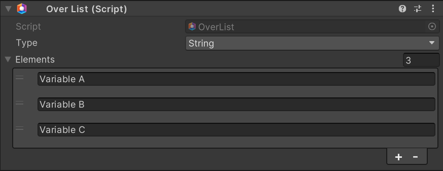 To use Lists, an OverList Component is required. It allows to define a custom list, ready to be used in the Visual Scripting System. The main parameters to be customized are: