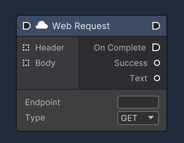 The "Web Request" node is designed to send HTTP requests from within the Unity environment. It supports GET and POST methods, allowing for data retrieval and submission to web services. Headers and body parameters can be specified, and the node outputs the success status of the request as well as the response text in JSON format. An execution flow is triggered upon completion of the web request, facilitating asynchronous operations and handling of the response data.