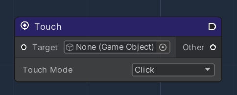 Each Touch Node must refer to a specific Target GameObject, accordingly equipped with a Unity Collider Component. Once a touch is detected and the Target is hit by the touch, the following nodes will be executed.