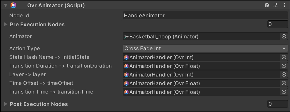 The OVER SDK provides two ways to achieve this: either via the State Name [CrossFadeString, accepting OvrString], or the Hash representation of said name [CrossFadeInt, accepting OvrInt].