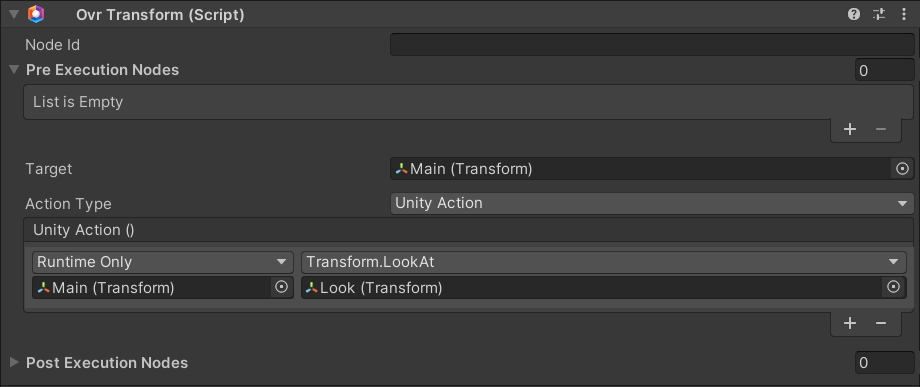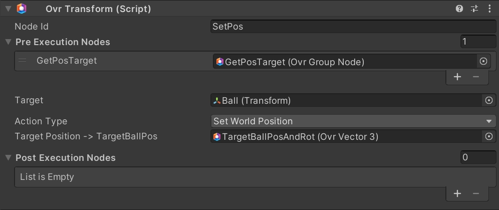 A collection of actions available for OvrTransform allows the user to set common Transform attributes, such as Position, Rotation (both in Local and World space), and local Scale.
