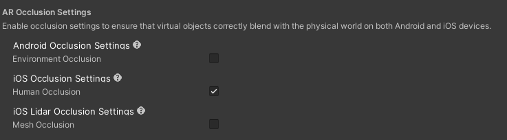 Activates the human occlusion on Apple devices, utilizing iOS's capability to recognize people within the camera's view. It allows virtual elements to appear as if they're going behind people, creating a more realistic AR experience.