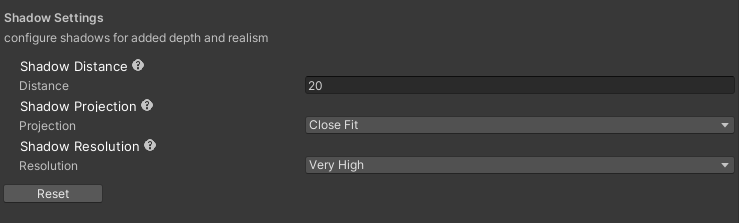 Shadows can be rendered at several different resolutions: **Low**, **Medium**, **High** and **Very High**. The higher the resolution, the greater the processing overhead.