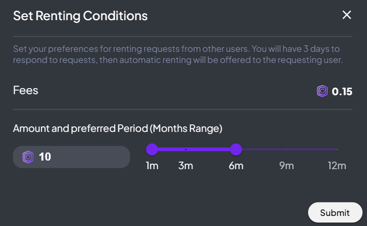 Additionally, you can set a price for your land during the rental period. Please be aware that the minimum accepted rental price is 10 OVR Tokens. Adjust these settings according to your requirements to establish clear and enticing conditions for potential renters.<br>