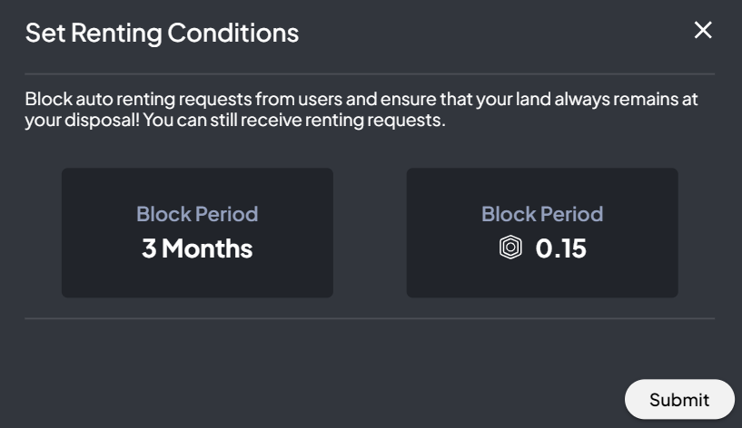You can block auto-renting requests from users to ensure that your land always remains at your disposal. You will still be able to receive renting requests manually. The block period will be 3 months and it will cost 0.15 OVR tokens